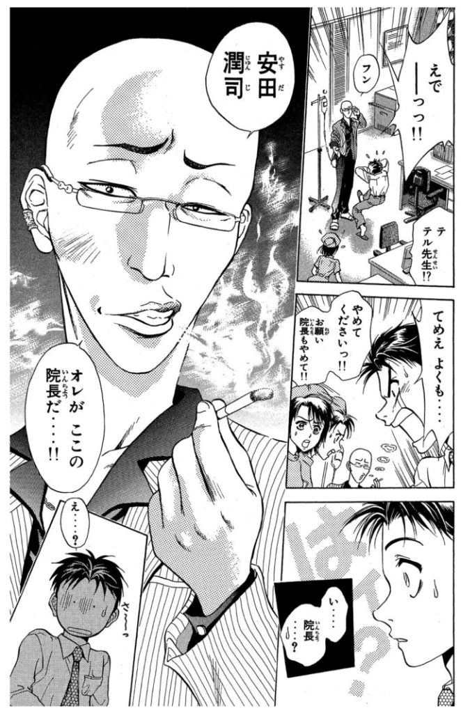 なお、名前とこの見た目、「どこかで覚えがある」という人もいるかも知れません。山本航暉『ゴッドハンド輝』に登場したカリスマ名医・安田潤司院長のモデルですね(なんでモデルなのか、つながりについては残念ながら知りません)。